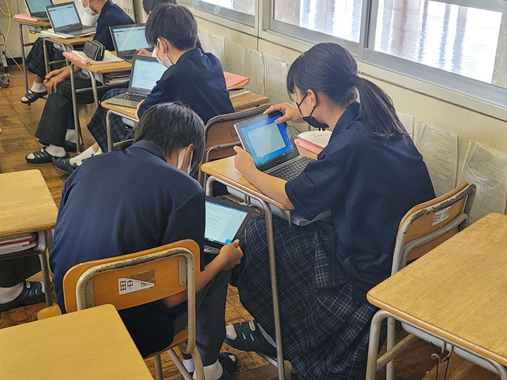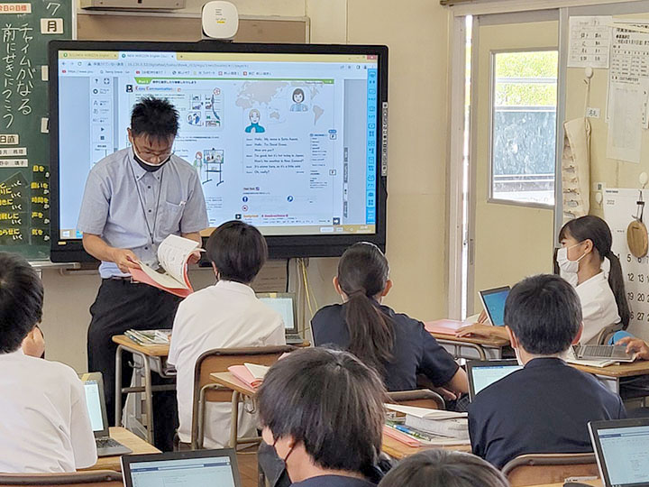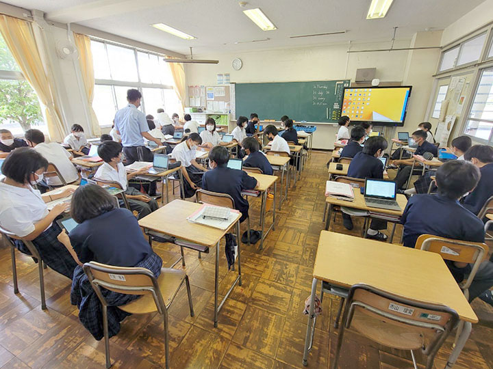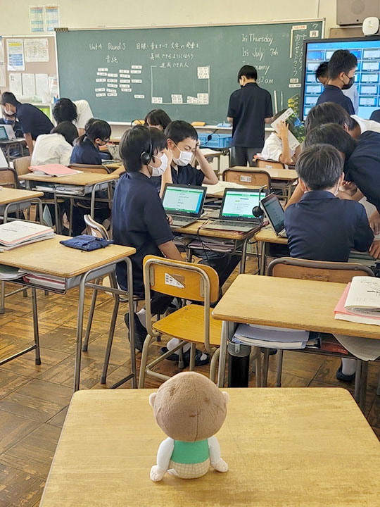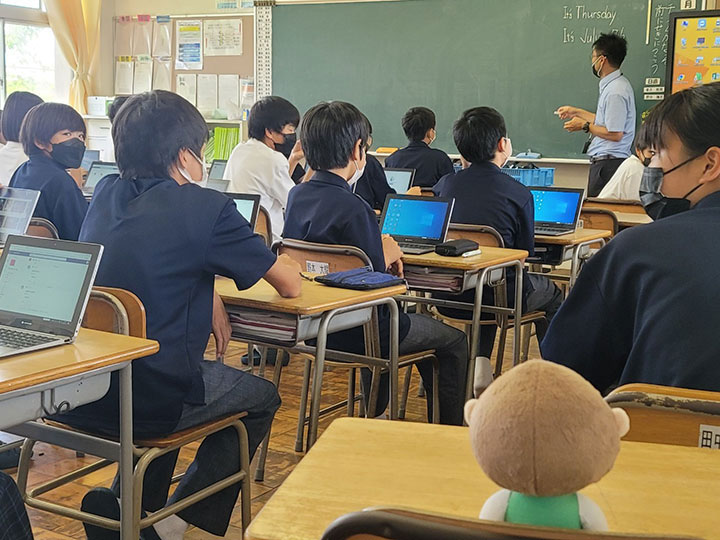 「英語‘ラーナー’ではなく、英語‘ユーザー’が多くなってほしいとのことから、英語が苦手な生徒たちも参加できるような授業を目指して、授業作りを考えています。中学校から英語を『書く』宿題や活動が増えます。書くことが苦手な生徒にとっての負担が大きくなり、英語嫌いに繋がっているように感じます。そこで、書く負担を減らすために、音読やスピーキングの時間を増やし、口にだして練習することで気軽に英語に取り組めるように配慮しています。例えば、書くことに困り感のある生徒には、タブレット端末のディクテーション機能を使って書けなくてもレポートが提出できる授業を模索したり、読むことに困り感のある生徒には、音声読み上げ機能や二次元コードの読み取りを使うことで読めるようになる授業を模索したりと、困り感のある生徒がこれならできるかもと思い、参加できる授業を目指しています。新型コロナ禍以前は洋楽を歌ったり、リズムで覚えるチャンツを使ったりして楽しい時間がとれたのですが。今は、生徒が我慢を強いられることが本当に多く、楽しく学習するのが本当に難しいです。」
