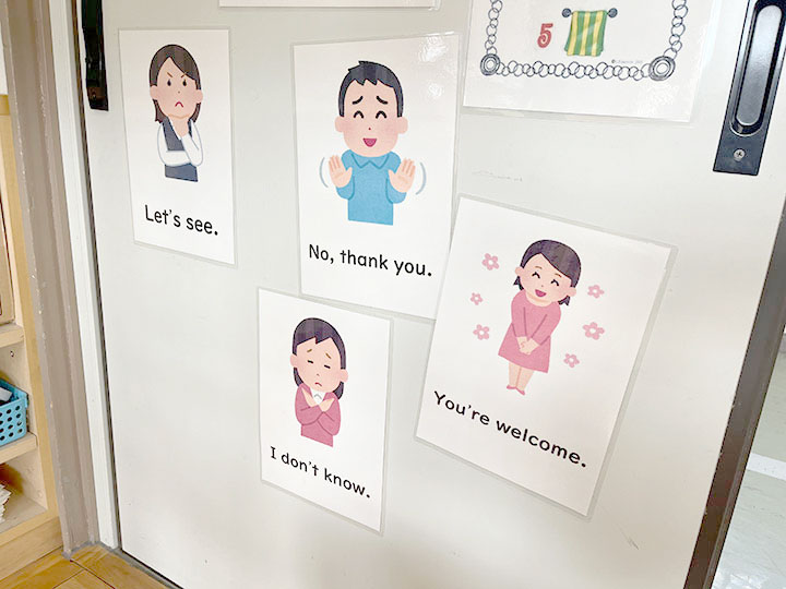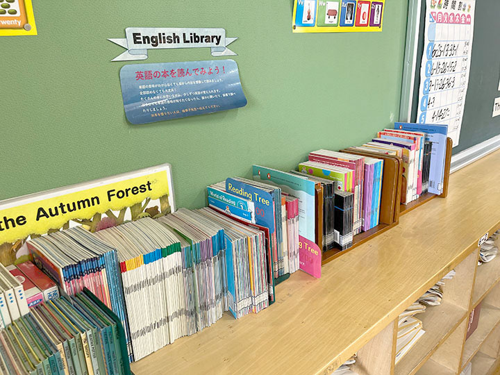 イングリッシュルームには、子どもたちがたくさん英語に触れられるように、いろいろな工夫がありました。中でも印象的だったのは、たくさんの英語の本! 難易度ごとに分類されていて、子どもたちは自分の好きな本を選んで読めるんです!