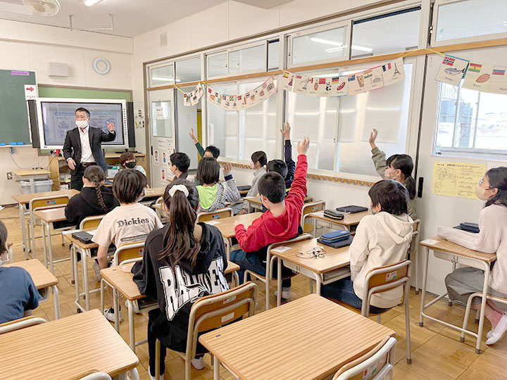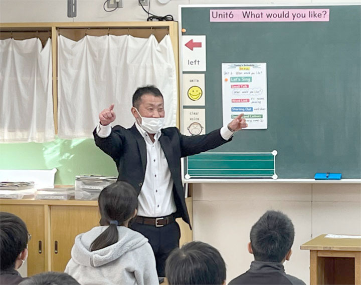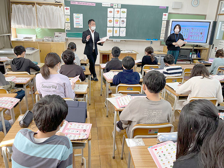 井田校長先生に、小学校での英語教育を進める中で感じたことを教えていただきました。「担任の先生が英語の授業を行うことで、学級づくりの延長で取り組めるため、子どもたちとより密なコミュニケーションを取ることにつながっていると思います。ただ、その一方で、まだ英語の授業に不安を感じている先生も多い。今後の課題として、専科教員やALTの先生が中心となり、英語授業のノウハウを普及させることで、先生の不安が少しでも払拭されると良いと考えます。」