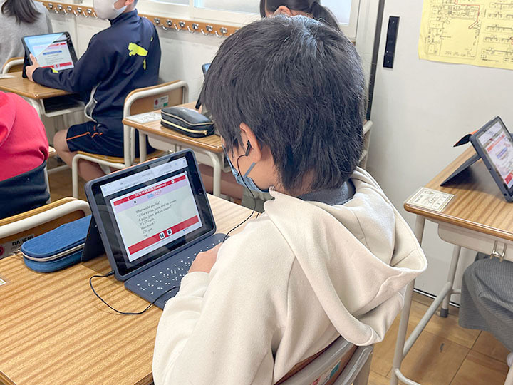 みんなで歌ったあとは、個人で歌の練習をします。ここで活躍するのが、学習者用デジタル教科書! 子どもたちはイヤホンを使って、学習者用デジタル教科書から流れる音声を聴きながら練習していました。