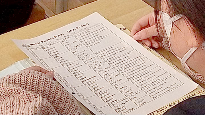 はじめにこの単元で学習する単語を確認します。全員で単語表を読み上げたあとは、ペアになって日本語を聞いて英語で答えられるかどうか、確認していきます。