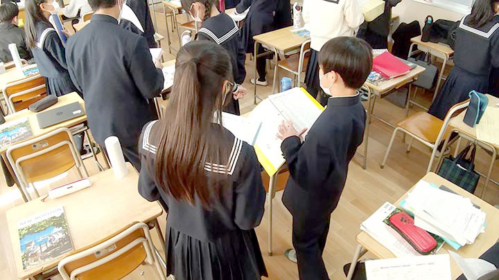 そして音読練習を行います。最初は教科書本文を全員で音読します。そのあとは映像と一緒に音読してから、今度は生徒だけで音読をします。