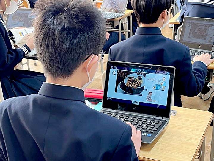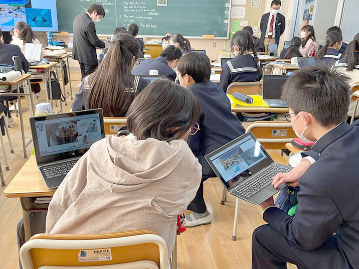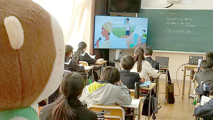 教科書本文の映像を視聴します。映像だと場面が理解しやすく、実際のコミュニケーション場面をイメージしやすいので、あえて映像を見せているそうだよ。