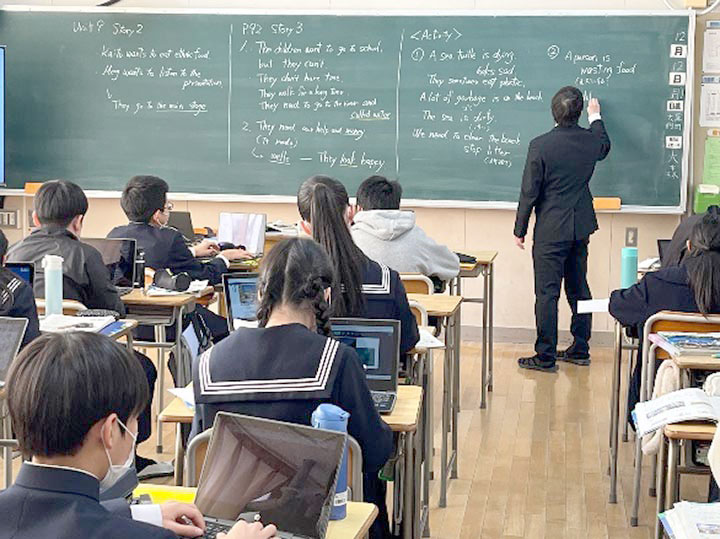 今日は英語の授業を見せていただきましたが、学校の特長の一つに「帰国生徒教育」があるそうです。各学年には帰国生徒だけのクラスがあって、それぞれ十数人の帰国生徒さんが在籍しています。海外で3年以上生活していた生徒さんに対して、日本での学習や生活に適応できるように指導しているんだって。