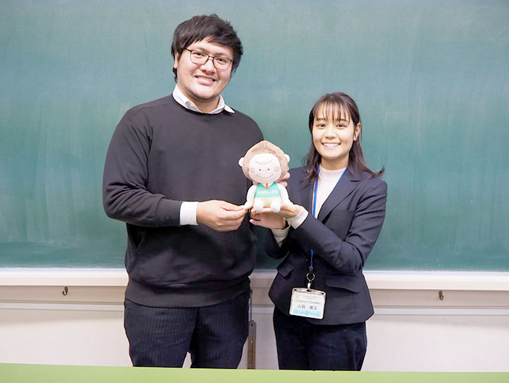 担任の古枝愛未(ふるえだ まなみ)先生は、なんと3年目。これから英語をがんばっていこうと燃えている若手の先生なんだ。お隣はALTのロン先生だよ。
