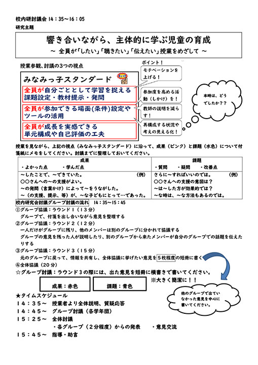 古枝先生は「はじめての校内研でとても緊張しました。もっと子どもたちの思いを引き出したかったですが、コミュニケーションメモを導入したことで、活動が取り組みやすくなっていたのがよかったです。これからも子どもたちと一緒に、よりよい授業を考えていきたいです」と話していたよ。
