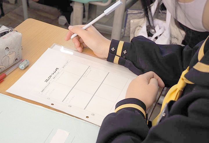 そのおかげで、2クラス目の授業から「コミュニケーションメモ」というワークシートを使って中間評価を可視化することにしたんだけど、回を追うごとに言語活動が改善されたんだ。