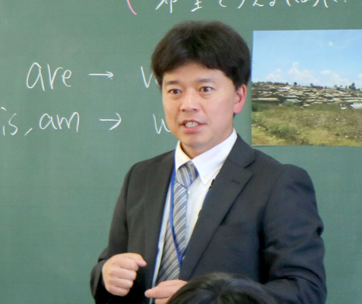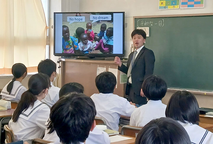 ケニアのスラム街と、そこに住む子どもたちの現状について、生徒に写真やイラストを見せながら、木村先生が英語で説明します。生徒は静かに聞いています。