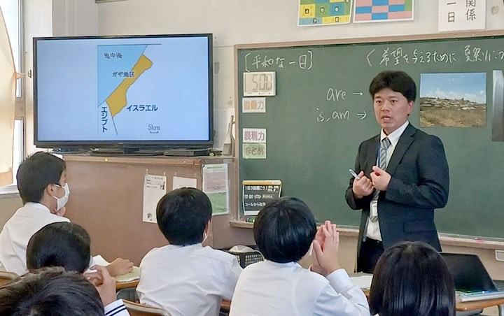 音読練習を終え、スライドに戻ります。ウクライナの写真、そしてイスラエルの地図とニュースの一場面。ケニアの話題から発展させ、「まさに今、世界で何が起きているか。」も伝えます。生徒たちは、ウクライナについては知っていたけれど、イスラエルの出来事はまだあまり知らなかったみたい。真剣な表情でスライドを見ていました。