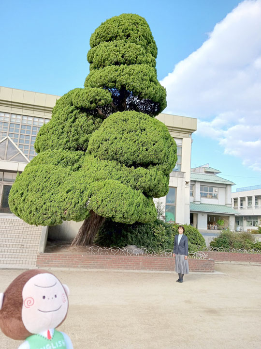 鎌田明美(かまだ あけみ)校長先生に並んでもらうと圧巻の大きさ……ヒノキ科の「カイヅカイブキ」という木だそうです。子どもたちのお気に入りの場所になっていて、木の下で涼んだり、木を見上げて癒されたりするんだって。えいごりらも、故郷の大木を思い出しちゃうな。