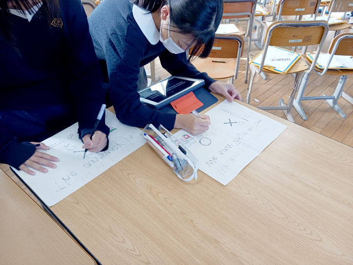 最後に、今日の振り返りをグループで意見を出し合って、ワークシートに書いていくよ。