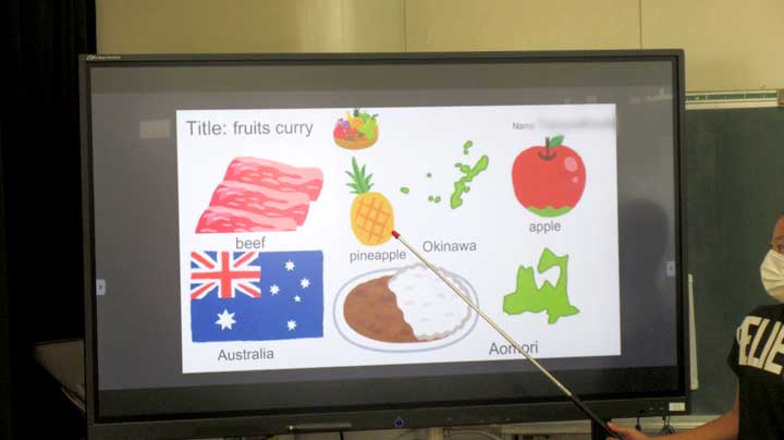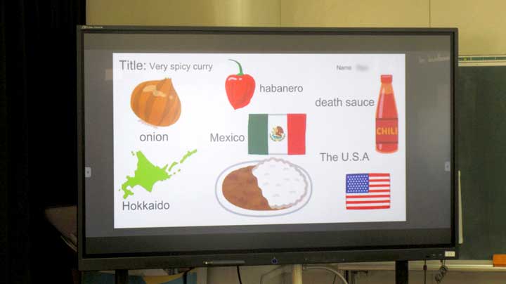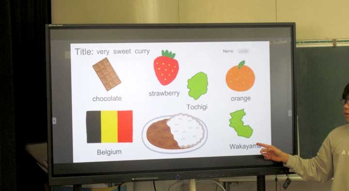 次は、子どもたちが一人ずつ順番に、電子黒板の前で自分のオリジナルカレーを発表します。