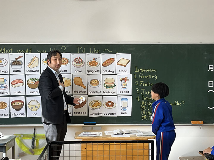 黒板に書いてある英文を確認しながら、丁寧にやり取りをしているね。西本先生のサポートも受けながら最後までできました。