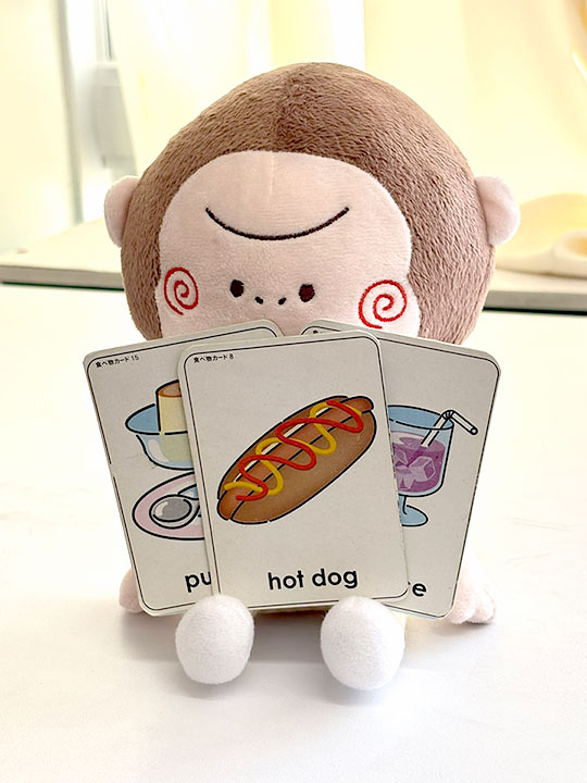 えいごりらも食べ物カードをもらったんだ。一緒にお店屋さんごっこができて嬉しいなぁ。