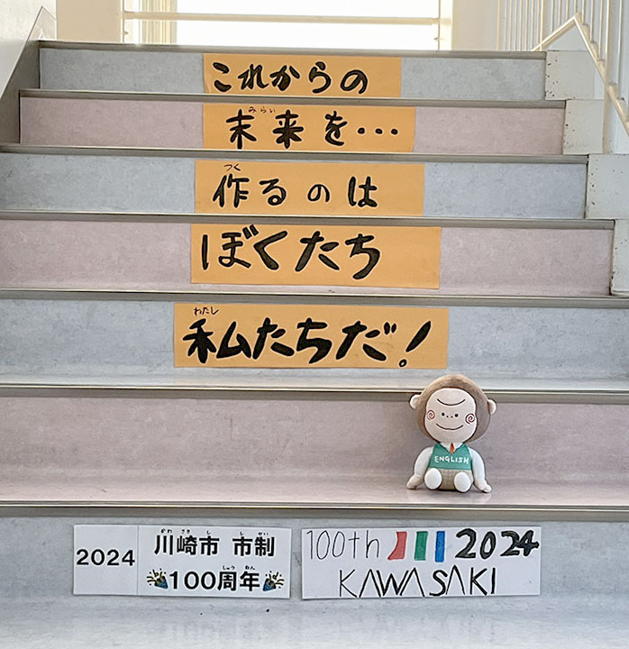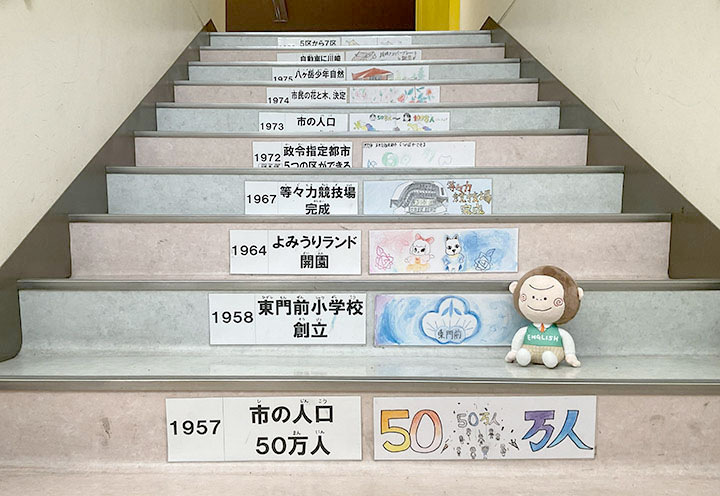 川崎市の歴史を楽しく学びながら階段を上っていくよ。東門前小学校は1958年に設立されたんだね!