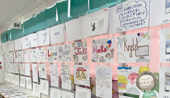 1番下の画用紙には二次元コードがあって、子どもたちがGIGA端末でアクセスすると、ALTが簡単な英語で自己紹介してるんだって!
