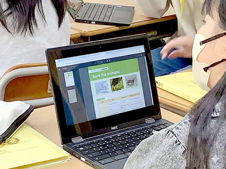 動物を選ぶときには、学習者用デジタル教科書も大活躍! ページを開くと、いろいろな動物や環境問題のトピックがずらりと並んでいるね。たくさんの語彙の中から、自分が一番伝えたい表現を自由に選んで使えそうだね。